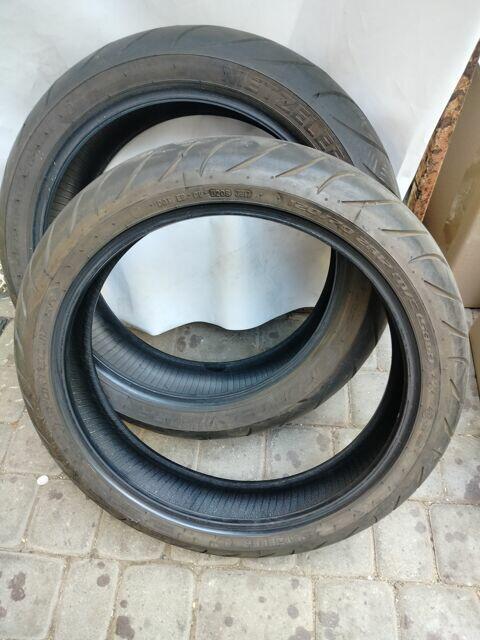 Sprzedam opony używane do motocykla o wymiarach przód 120/70 17 i tył 180/55 17 rok produkcji 2017 bieżnik 3,0 mm.