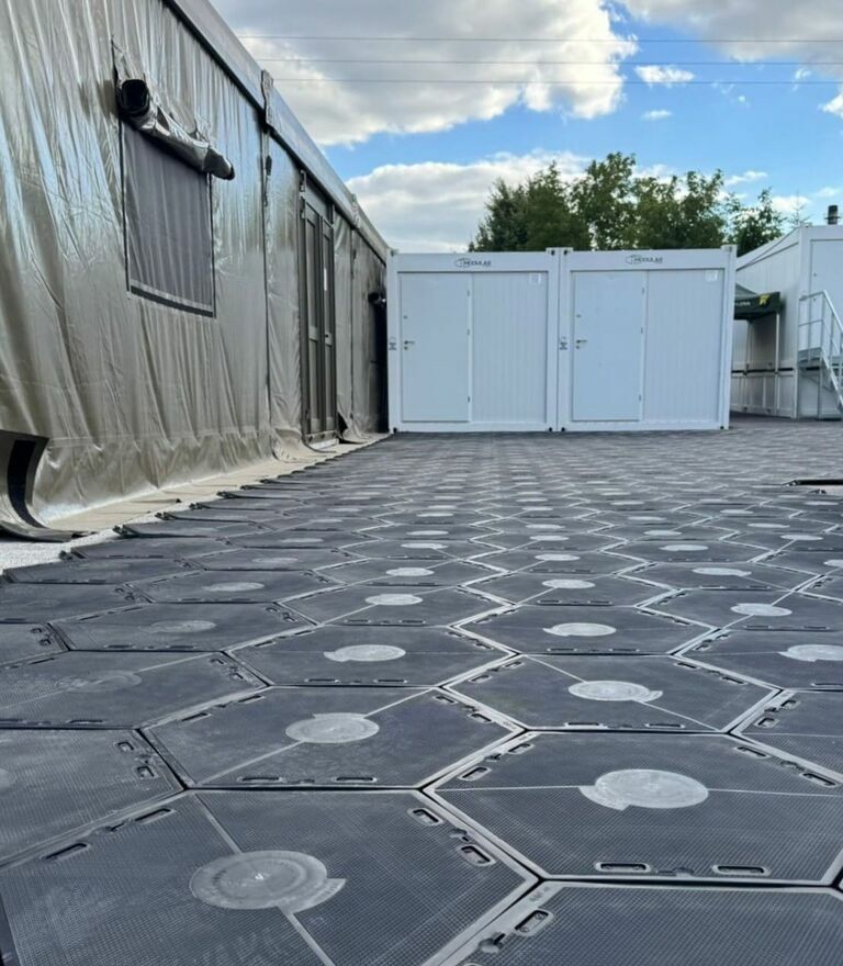 Firma X-floor oferuje modułowy system podłóg technicznych, przeznaczony do szybkiego utwardzania gruntu podczas wydarzeń plenerowych oraz realizacji tymczasowych. Zapewniamy stabilne i bezpieczne nawierzchnie wykorzystywane pod namioty eventowe, zaplecza techniczne oraz konstrukcje tymczasowe, jak również jako drogi dojazdowe, ciągi komunikacyjne, parkingi, place manewrowe, garaże oraz powierzchnie magazynowe i zewnętrzne na terenach o ograniczonej nośności i utrudnionym dostępie.Płyty wykonane z wytrzymałego polipropylenu (PP) z dodatkiem stabilizatorów UV, co gwarantuje długą żywotność i bezpieczne użytkowanie w każdych warunkach. Nie wymagają fundamentów ani ingerencji w podłoże. Montowane są szybko, bez użycia narzędzi, a po wydarzeniu mogą być wielokrotnie demontowane i ponownie wykorzystane.
